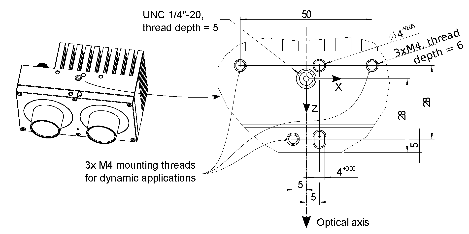 For troubleshooting and static applications, the sensor may be mounted using the standardized tripod thread (UNC 1/4”-20) indicated at the coordinate-frame origin. For dynamic applications such as mounting on a robotic arm, the sensor must be mounted with three M4 (metric standard) 8.8 machine screws tightened to 2.5 Nm and secured with a medium-strength threadlocking adhesive such as Loctite 243. Maximum thread depth is 6 mm. The two 4 mm diameter holes may be used for positioning pins (ISO 2338 4 m6) to ensure precise repositioning of the sensor.