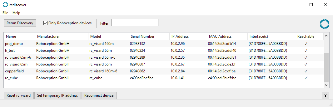 Roboception offers the open-source tool rcdiscover-gui, which can be downloaded free of charge from https://github.com/roboception/rcdiscover/releases for Windows and Linux. The tool’s Windows version consists of a single executable for Windows 7, 10 and 11, which can be executed without installation. For Linux an installation package is available for Ubuntu.